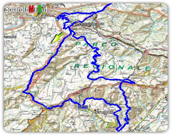 Itinerario non lungo, ma impegnativo, su 2 versanti,Borgo Tossignano e Casola Valsenio. Si inizia a salire con belle viste sulla vallata del Santerno e si prosegue fino in cima al Prugno.Segue una lunga discesa, molto panoramica fino a Casola Valsenio nel versante del Senio, per poi risalire di nuovo nel versante del Santerno.Percorso da effettuare in giorni non piovosi, si trovano un paio di tratti da fare a piedi con la MTB in spalla per la presenza di un paio di frane e sentieri pericolosi.L'itinerario è stato percorso completamente dal Team di Solarolomtb.it